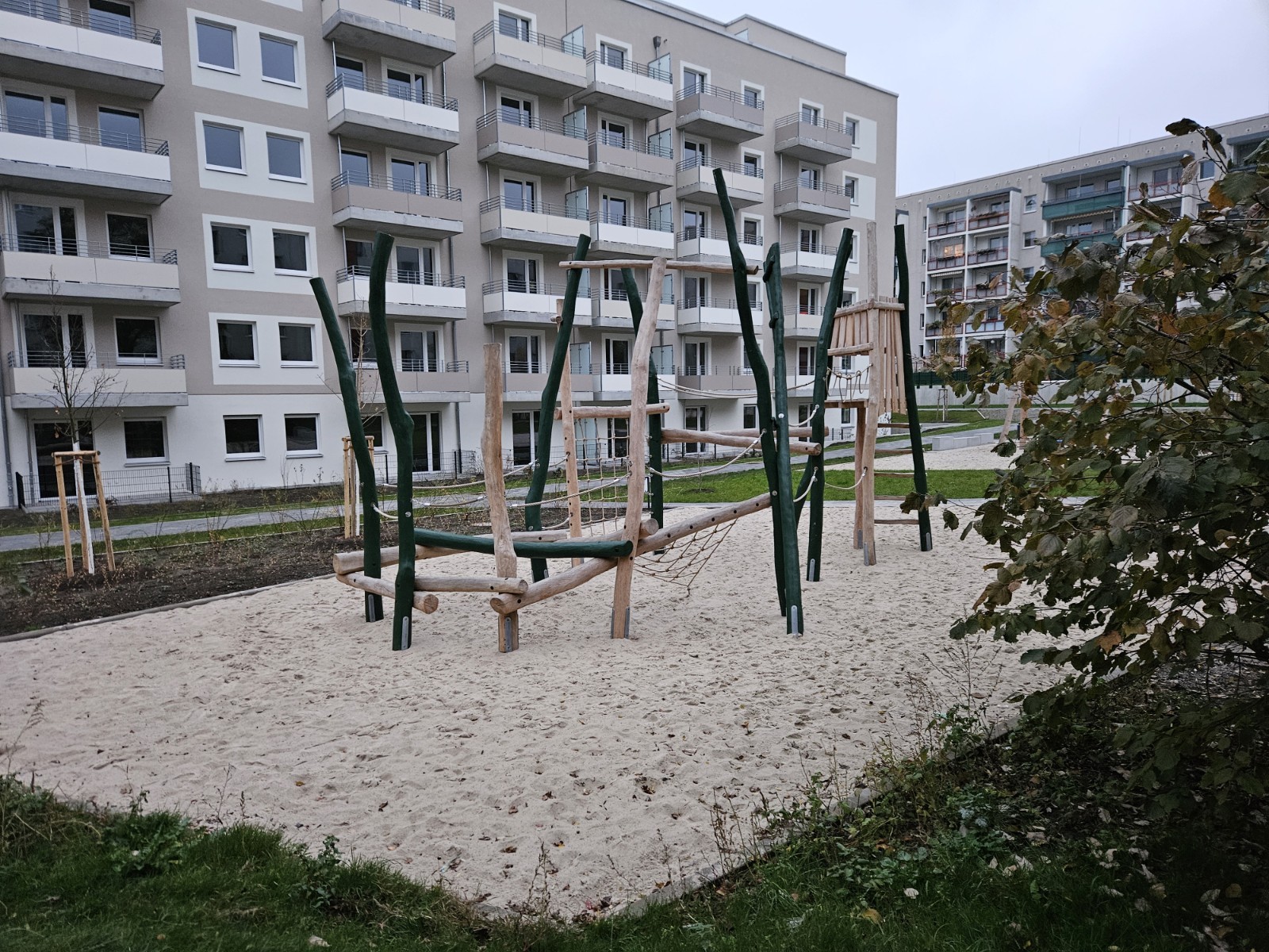 Ergänzt wird das Ensemble durch eine Gewerbeeinheit – eine Kinderarztpraxis –, die die soziale Infrastruktur des Quartiers stärken soll. Im Außenbereich entstanden Grünanlagen, ein Spielplatz sowie 48 PKW-Stellplätze und zahlreiche Fahrradstellplätze.