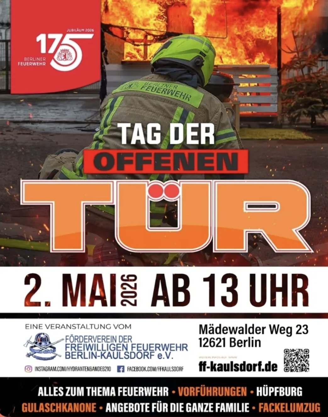 Zum 175-jährigen Jubiläum der Berliner Feuerwehr lädt der Förderverein der Freiwilligen Feuerwehr Berlin-Kaulsdorf am Samstag, dem 2. Mai 2026, zum Tag der Offenen Tür ein.