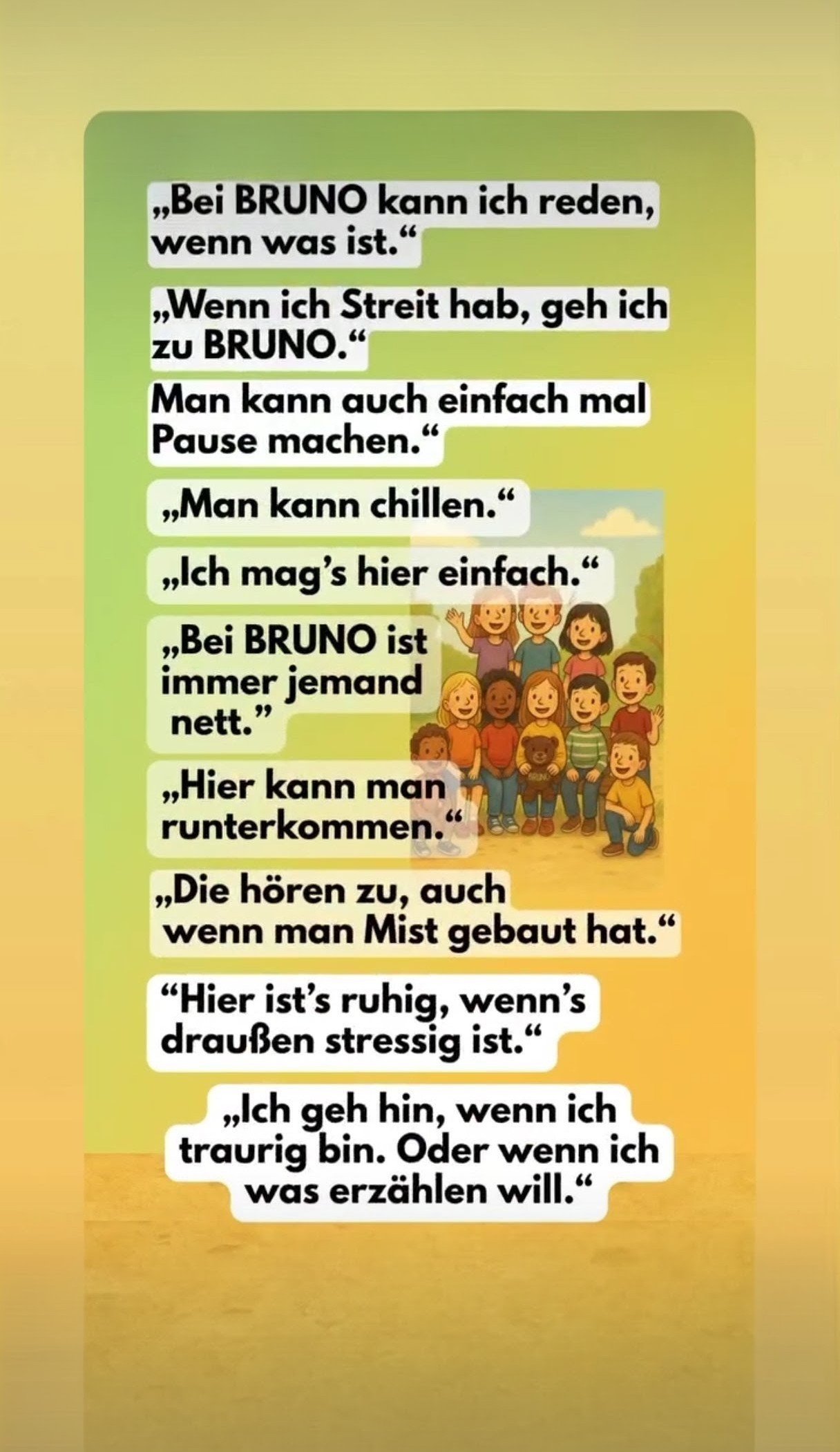 Im Rahmen der Aktion sind mehrere liebevoll gestaltete Illustrationen entstanden, die zeigen, was BRUNO für die Kinder bedeutet: Vertrauen, Mut, Gemeinschaft und Wärme.