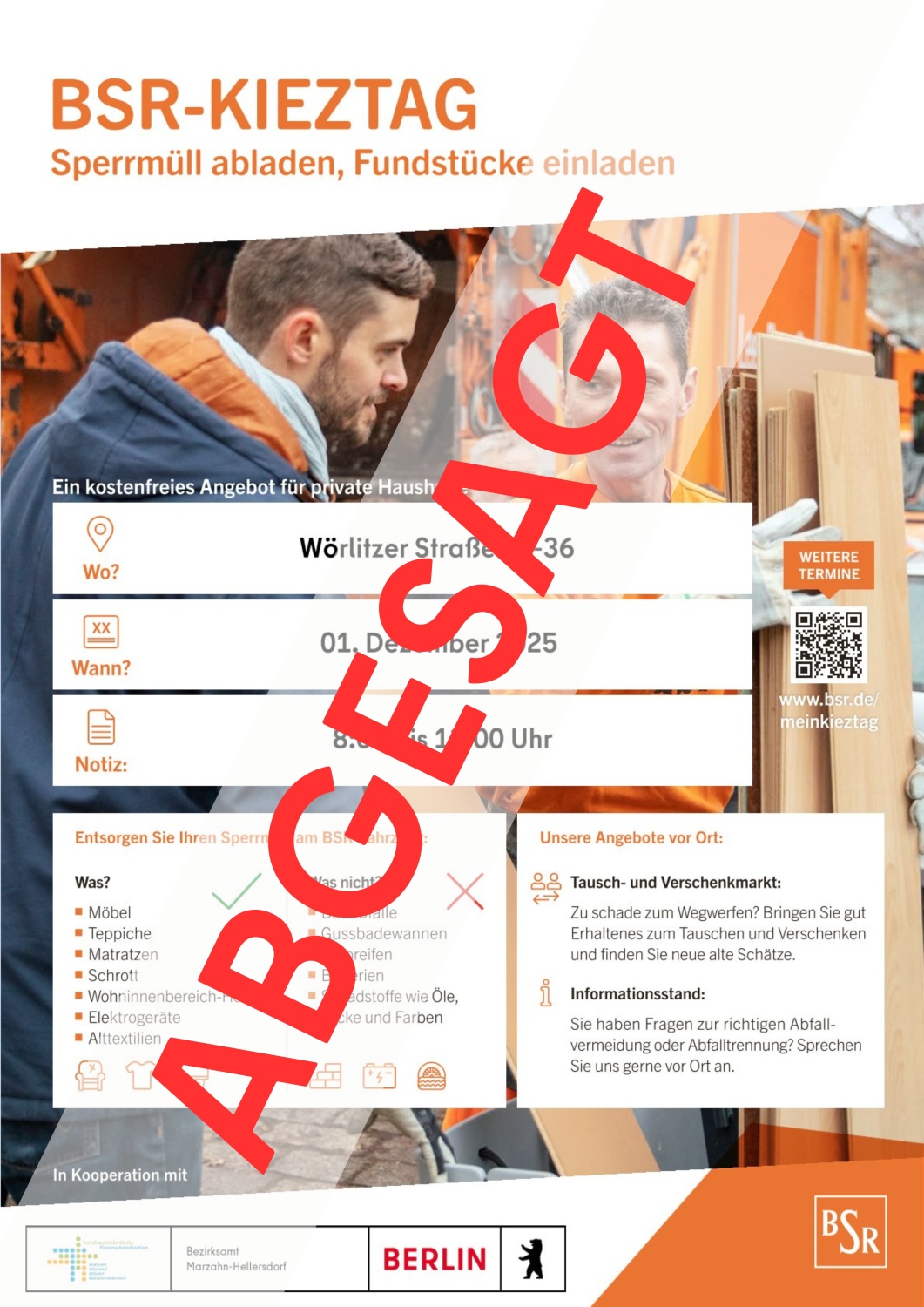 Das Bezirksamt Marzahn-Hellersdorf und die Berliner Stadtreinigung (BSR) teilen mit, dass der für den 1. Dezember 2025 geplante Kieztag in Marzahn-Nord aufgrund außerplanmäßiger technischer Probleme abgesagt werden muss.
