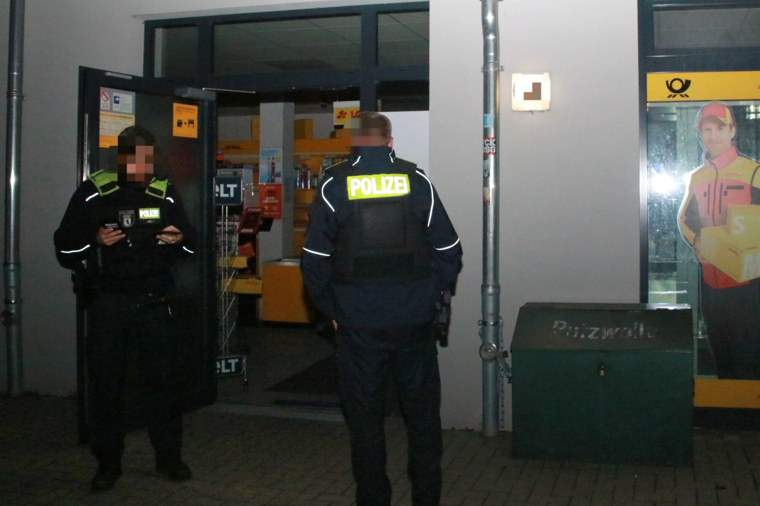 Einsatzkräfte der Berliner Polizei trafen kurz darauf am Tatort im Karl-Philipp-Moritz-Weg ein und durchsuchten das Geschäft – mit den Händen an ihren Dienstwaffen, da zunächst unklar war, ob sich noch Personen im Inneren befanden. Im Laden selbst fanden die Beamtinnen und Beamten keine Täter mehr vor.