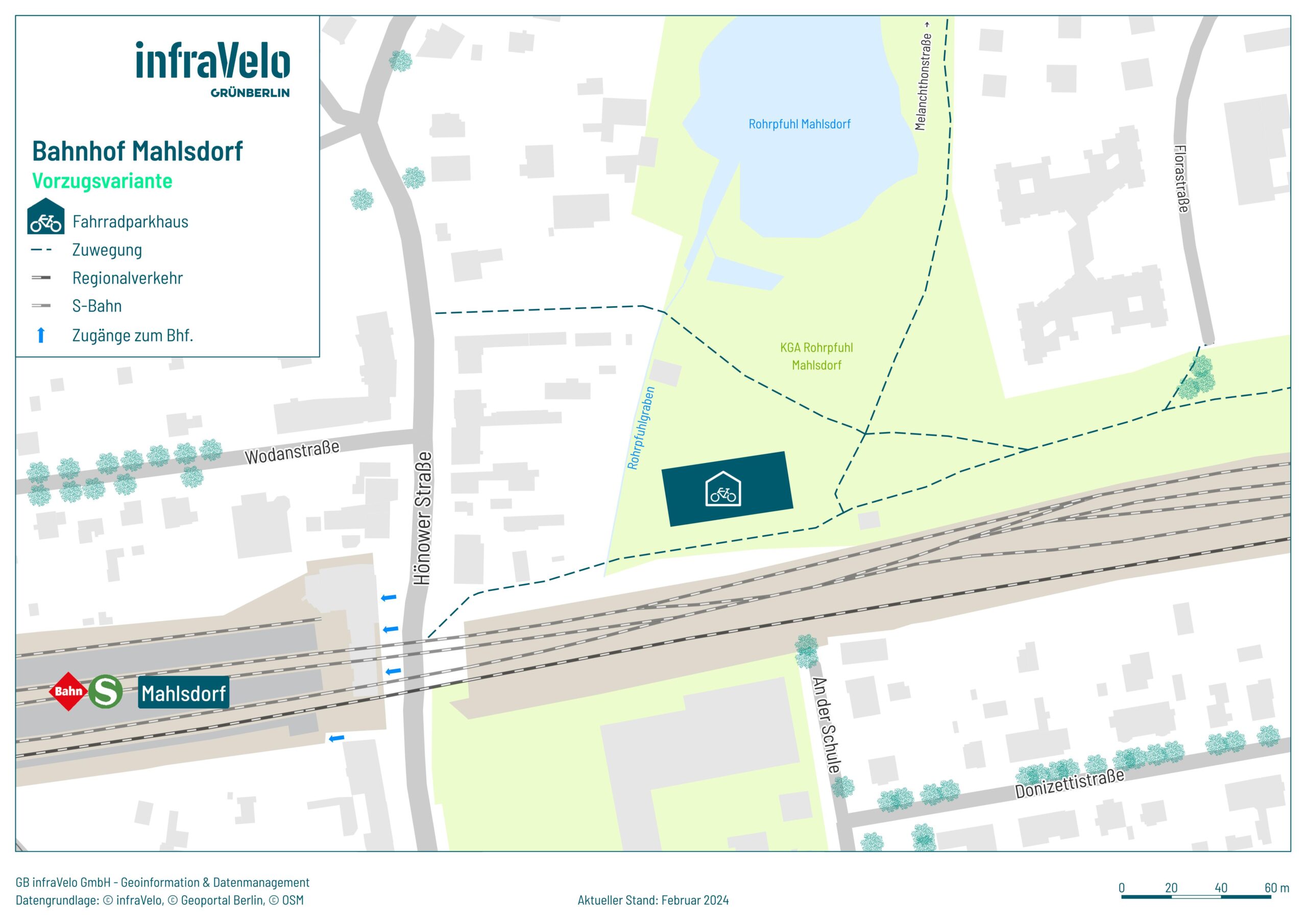 Durch den geplanten Umbau zum Regionalbahnhof wird ein deutlich steigender Bedarf an Fahrradstellplätzen erwartet. Laut Machbarkeitsuntersuchung der infraVelo GmbH könnte zwischen Florastraße und Hönower Straße ein eingeschossiges Fahrradparkhaus mit rund 700 Stellplätzen entstehen, davon etwa 210 gesicherte Stellplätze sowie rund 20 Stellplätze für Fahrräder mit besonderem Flächenbedarf; zusätzlich ist die Integration eines Servicebereichs vorgesehen. Grundlage hierfür sind Standort- und Potenzialanalysen aus dem Jahr 2018 sowie weiterführende und in den Jahren 2021 und 2023 plausibilisierte Berechnungen, die bis zum Jahr 2030 einen zusätzlichen Bedarf von rund 700 Fahrradstellplätzen am Bahnhof Mahlsdorf ausweisen (Quelle: infraVelo GmbH).
