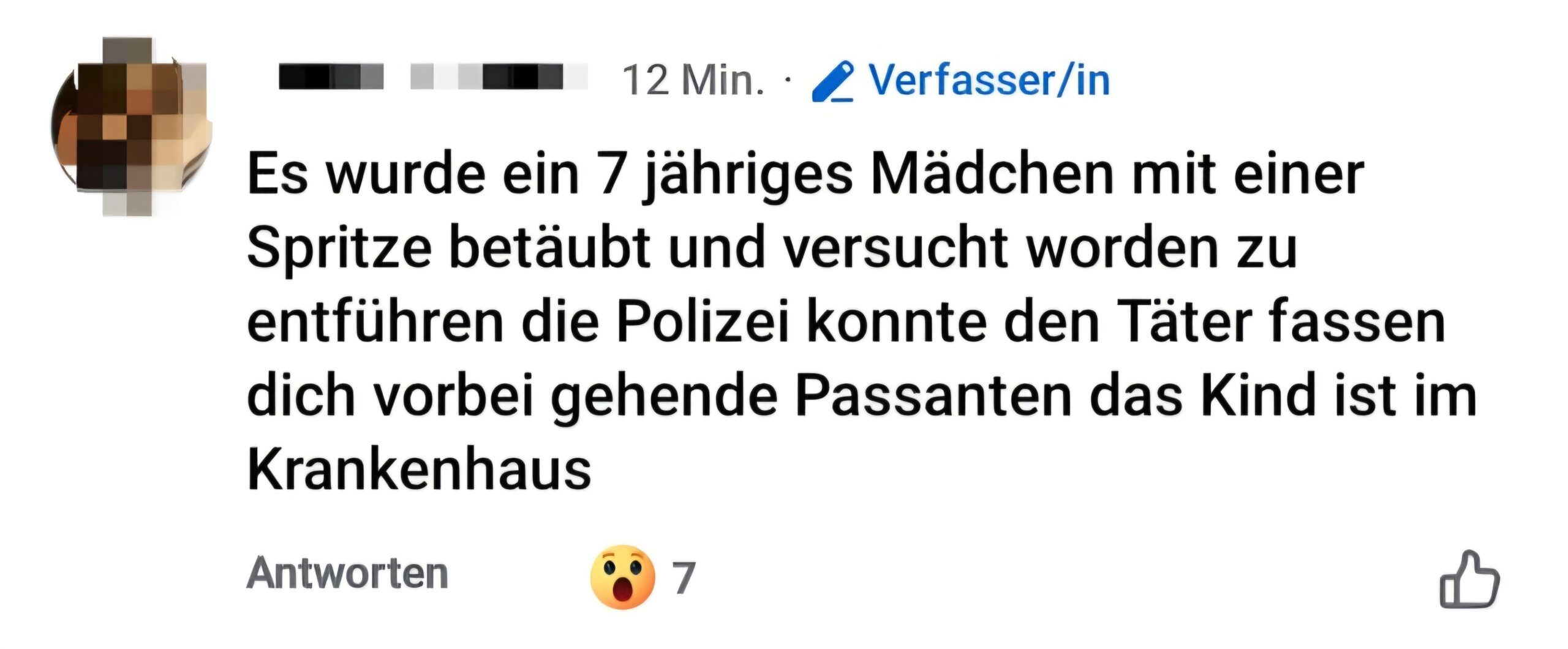 In einer Hellersdorfer Facebookgruppe sorgte am Mittwoch ein schockierender Beitrag für erhebliche Aufregung. Eine Nutzerin berichtete dort, ein siebenjähriges Mädchen sei angeblich mit einer Spritze betäubt und beinahe entführt worden. Laut der Schilderung habe die Polizei den Täter dank couragierter Passanten festnehmen können, das Kind befinde sich im Krankenhaus.