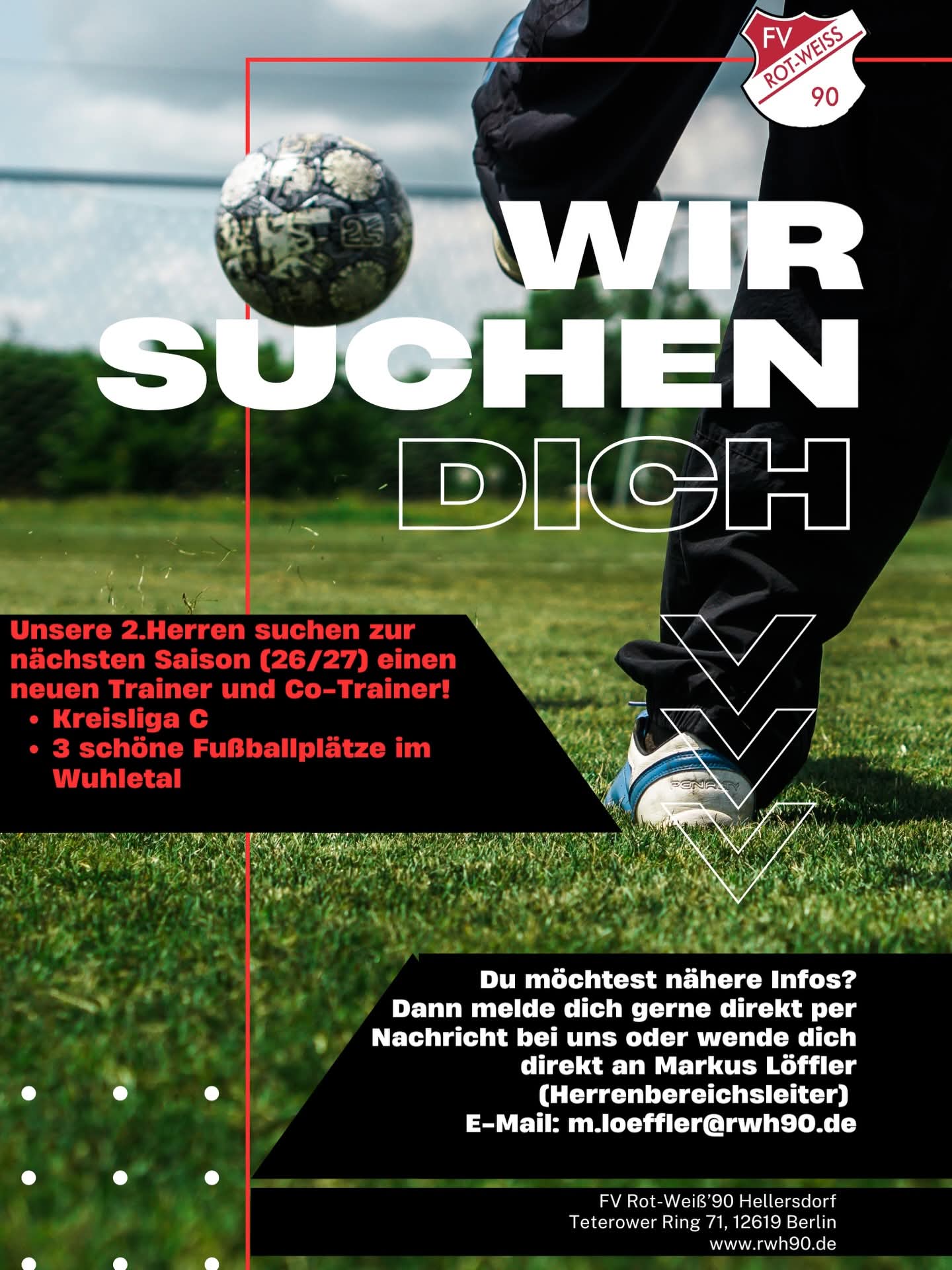 Der FV Rot-Weiß ’90 Hellersdorf verstärkt zur kommenden Saison sein Trainerteam: Der Marzahn-Hellersdorfer Fußballverein sucht einen Cheftrainer sowie einen Co-Trainer für die zweite Herrenmannschaft.
