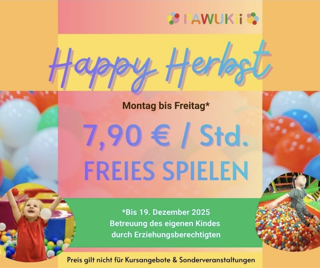 Im Indoorspielplatz PAWUKii im Kaufpark Eiche heißt es ab sofort: „Happy Herbst!“ – und das mit einem besonders familienfreundlichen Angebot. Noch bis 19. Dezember 2025 können Kinder hier zum Herbstpreis von nur 7,90 € pro Stunde frei spielen, toben und entdecken.