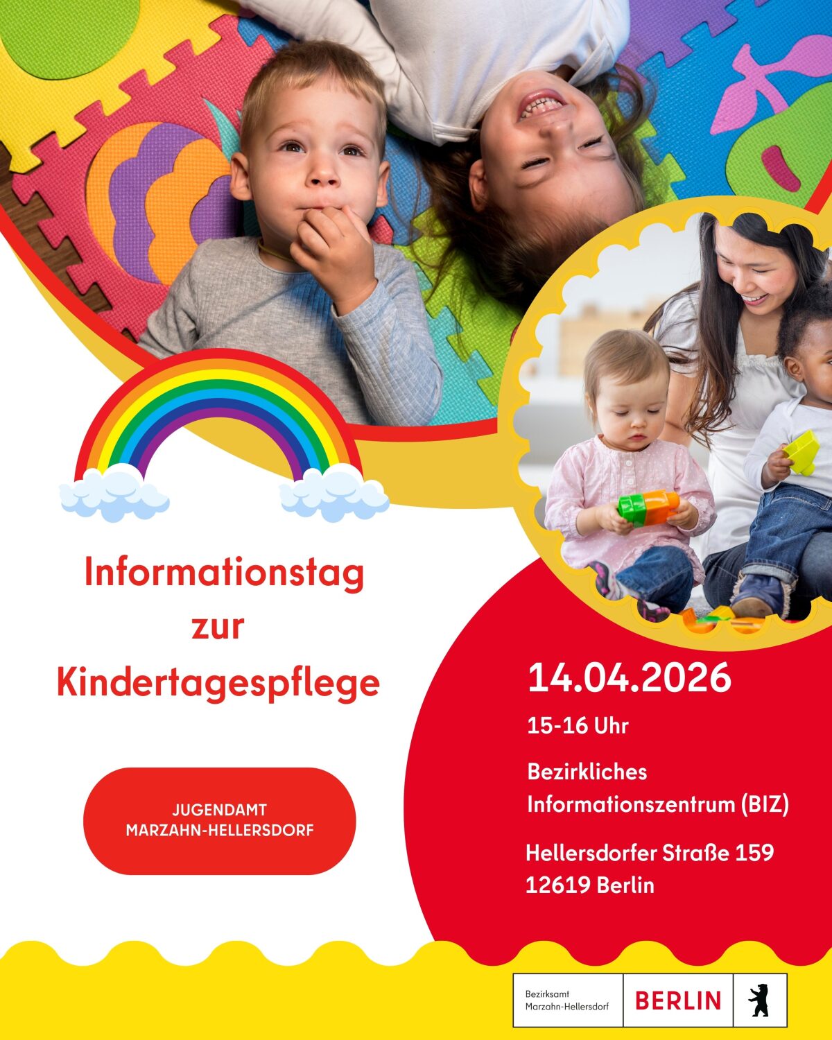 Heute lädt das Jugendamt Marzahn-Hellersdorf von 15 bis 16 Uhr zum Vorstellungsnachmittag rund um das Thema Kindertagespflege ein, teilt das Bezirksamt Marzahn-Hellersdorf in einer Pressemitteilung mit.