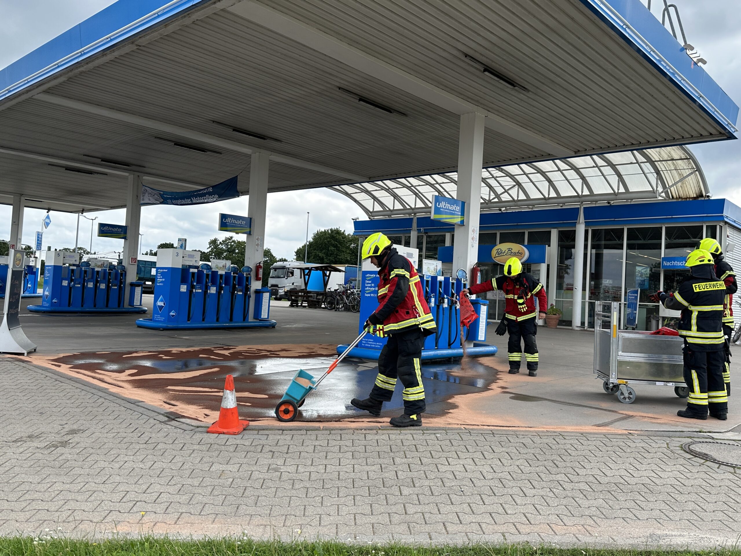 Gegen 13.30 Uhr wurde die Feuerwehr von den Mitarbeitern der Tankstelle alarmiert, nachdem ein mutmaßlicher technischer Defekt an einer Zapfsäule zu einem unkontrollierten Ausströmen von Kraftstoff führte.