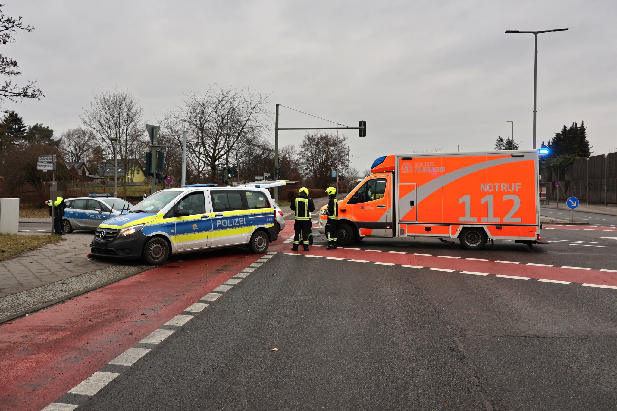 Nach bisherigen Informationen ereignete sich die Kollision kurz nach 13 Uhr im Kreuzungsbereich Blumberger Damm / Cecilienstraße. Beteiligt waren der Fahrer eines Mercedes sowie die Besatzung eines Funkstreifenwagens der Berliner Polizei.
