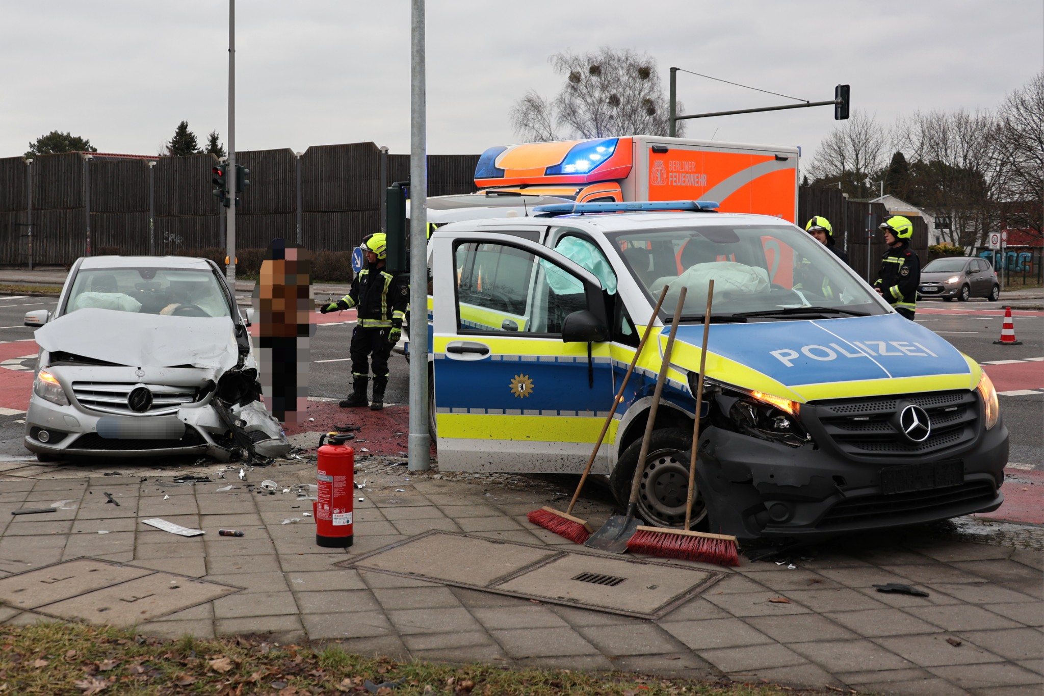 Nach bisherigen Informationen ereignete sich die Kollision kurz nach 13 Uhr im Kreuzungsbereich Blumberger Damm / Cecilienstraße. Beteiligt waren der Fahrer eines Mercedes sowie die Besatzung eines Funkstreifenwagens der Berliner Polizei.