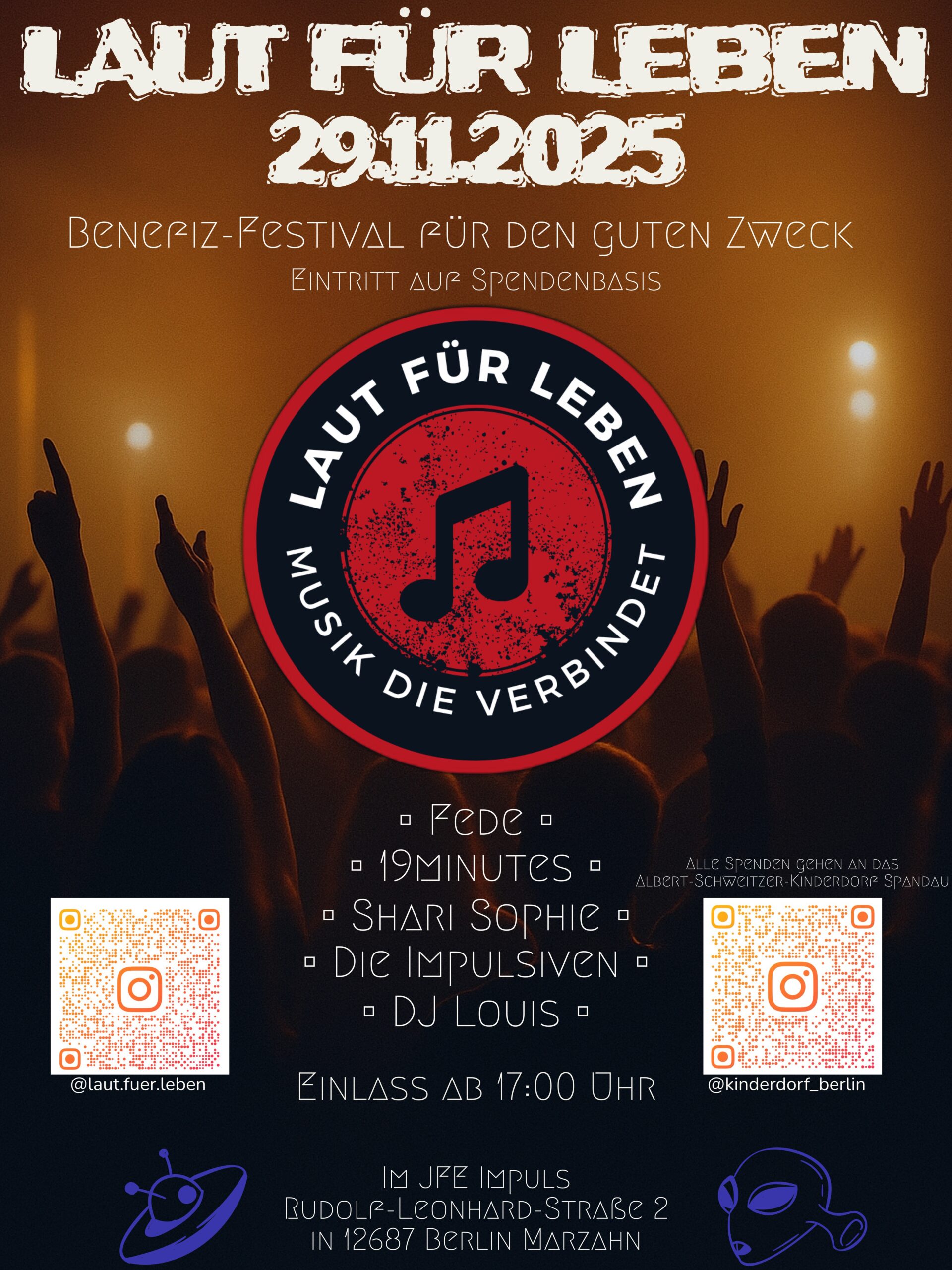 #LautFürLeben #Benefizfestival #BerlinEvents #LiveMusikBerlin #GemeinsamStark #Spendenaktion #Kinderstärken #Weihnachtsfreude #JFEImpuls #KinderdorfBerlin #SupportLocalMusic #MarzahnHellersdorf #Kiezkultur #Musikverbindet #SozialesEngagement #Gemeinschaft #CharityEvent #BerlinKultur #Sozialprojekt #Livekonzert #Jugendarbeit #KinderundJugendliche #Herzensprojekt #SpendenfürdenGutenZweck #BerlinMusicScene #Lokalunterstützen #CommunityPower #GutesTunMitMusik #Weihnachten2025