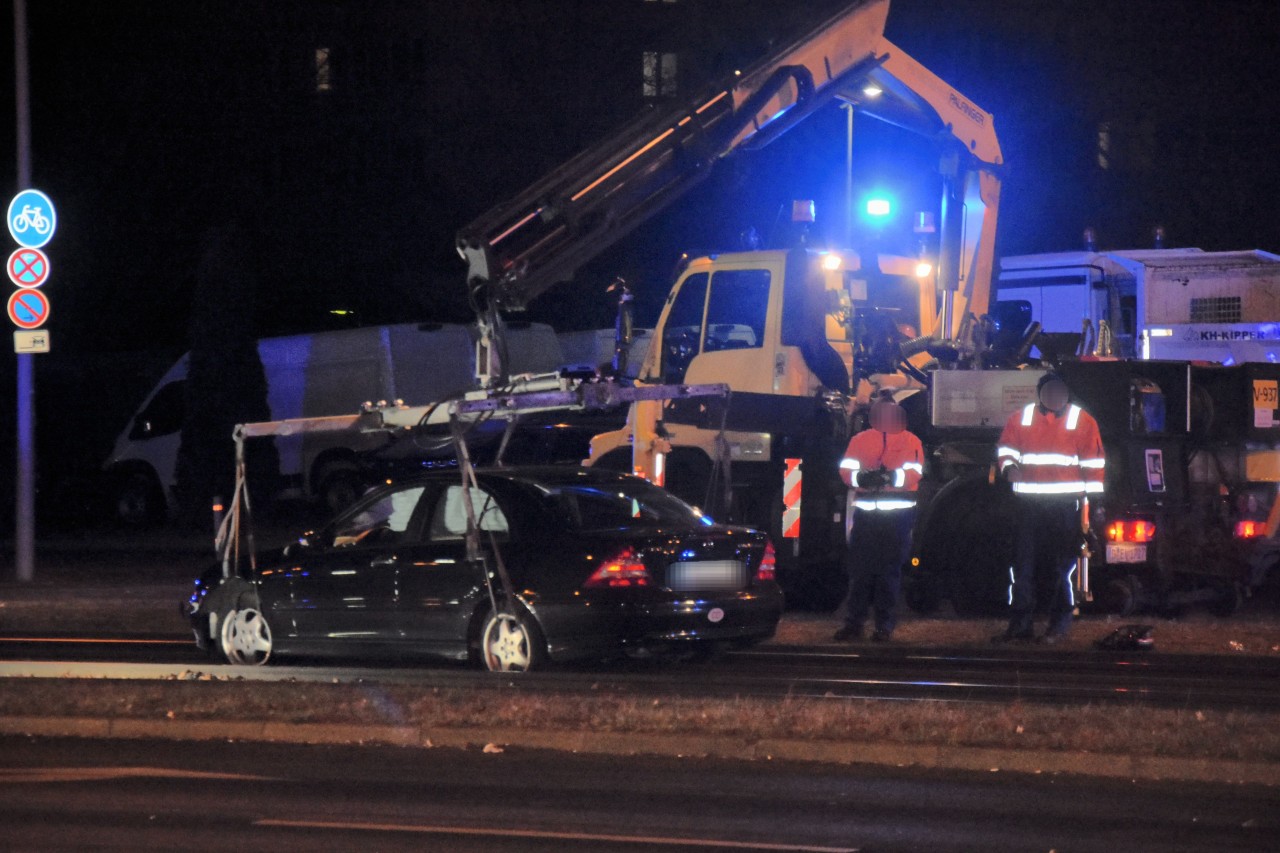 Kurz vor 1 Uhr geriet ein Mercedes-Fahrer aus bislang ungeklärter Ursache auf der Rhinstraße auf Höhe der Straßenbahngleise in Richtung Allee der Kosmonauten in das Gleisbett der Straßenbahn. Das Fahrzeug fuhr rund 35 Meter weit zwischen den Schienen, bevor es zum Stillstand kam.