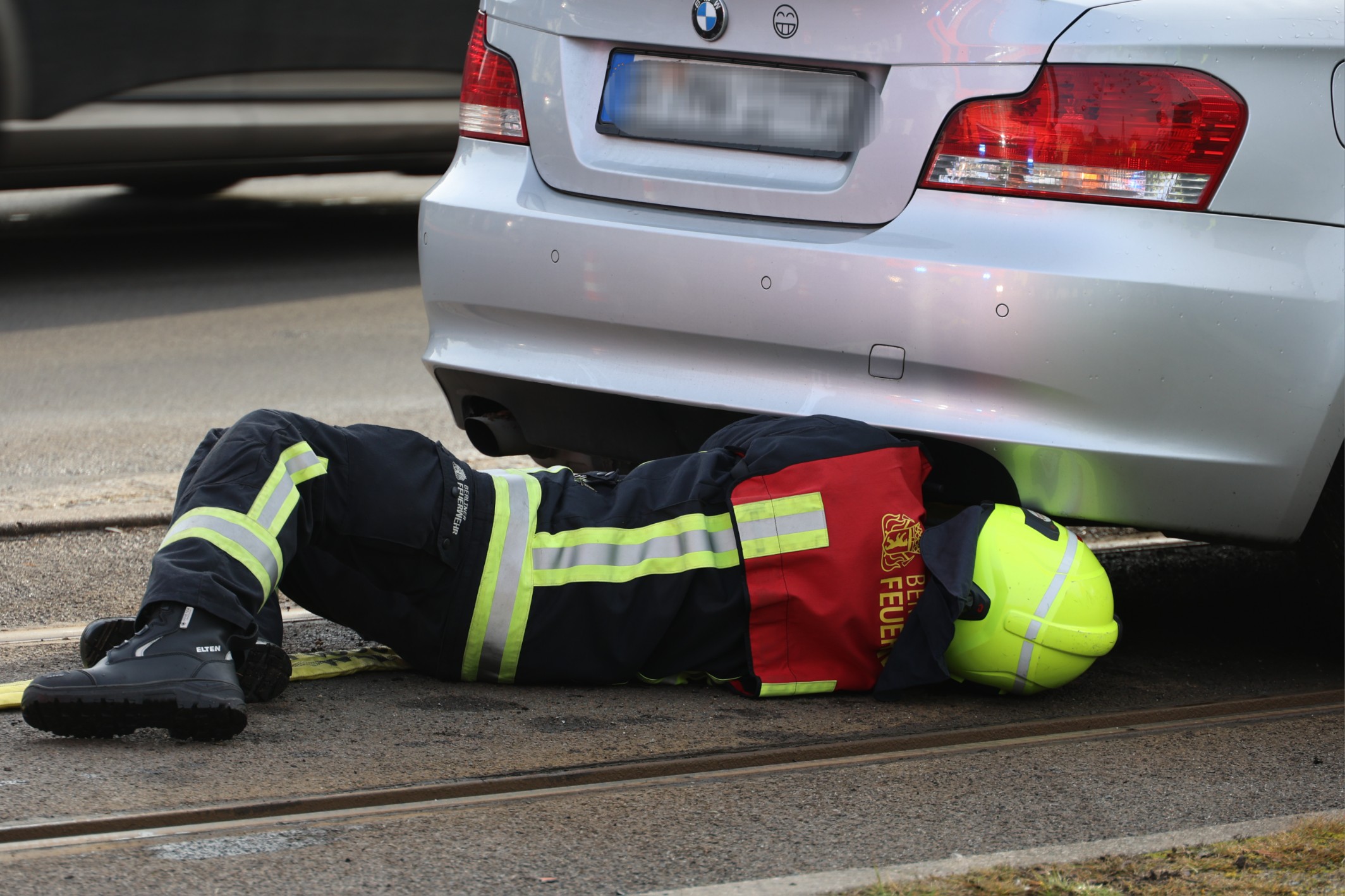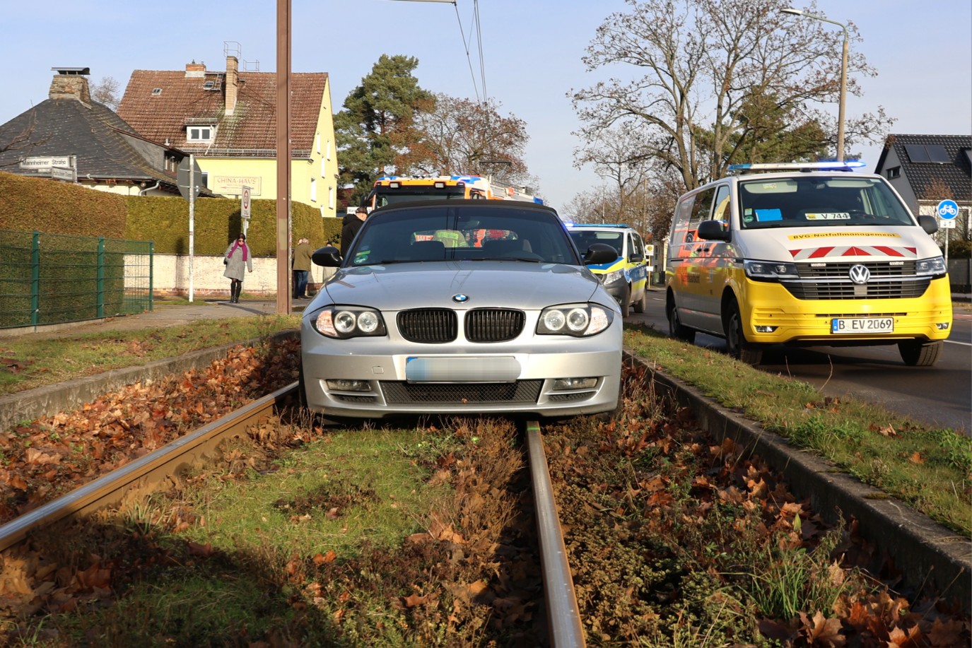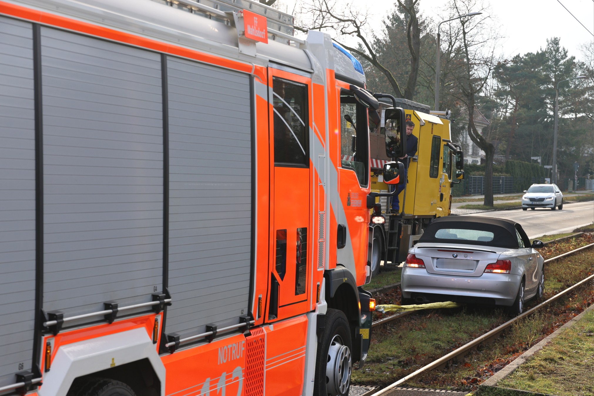 Den bisherigen Informationen zufolge geriet gegen 11.45 Uhr ein BMW-Fahrer auf dem Hultschiner Damm im Kreuzungsbereich zur Mannheimer Straße ins Gleisbett und kam nach rund acht Metern zum Stehen. Ein herannahender Straßenbahnfahrer konnte den Zug rechtzeitig stoppen und so einen Zusammenstoß verhindern. Polizei, die Freiwillige Feuerwehr Mahlsdorf sowie der Turmwagen der BVG eilten zur Unfallstelle.