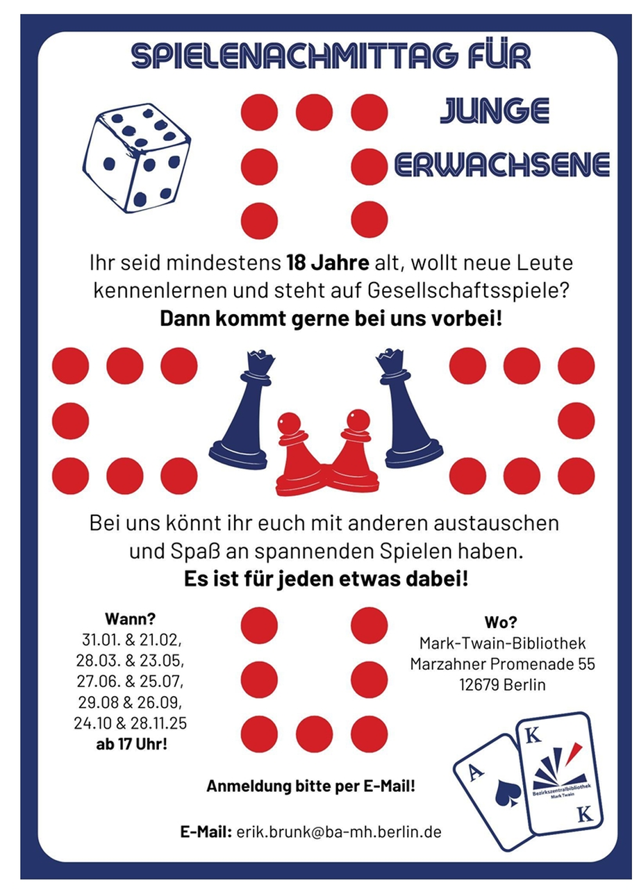 Die Mark-Twain-Bibliothek in der Marzahner Promenade lädt am 28.11.2025 zu einem gemeinsamen Spielenachmittag für junge Erwachsene ein.