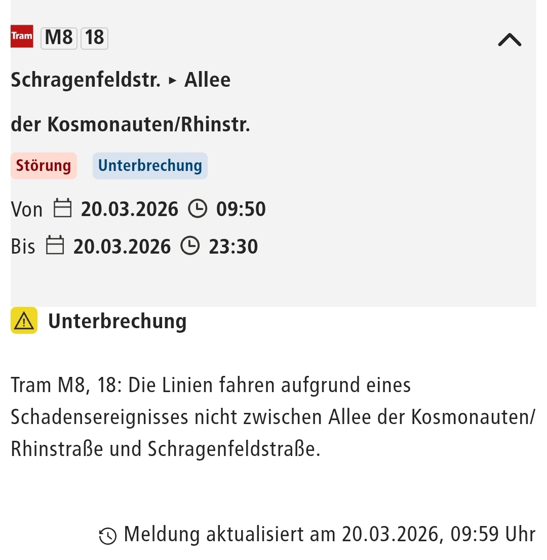 Auf der Allee der Kosmonauten in Marzahn ist es zu einer Beschädigung der Straßenbahn-Oberleitung gekommen. Betroffen sind u.a. die Linien M8 und 16 auf denen es derzeit zu Ausfällen kommt. Fahrgäste müssen bis auf Weiteres mit erheblichen Beeinträchtigungen im Straßenbahnverkehr rechnen.