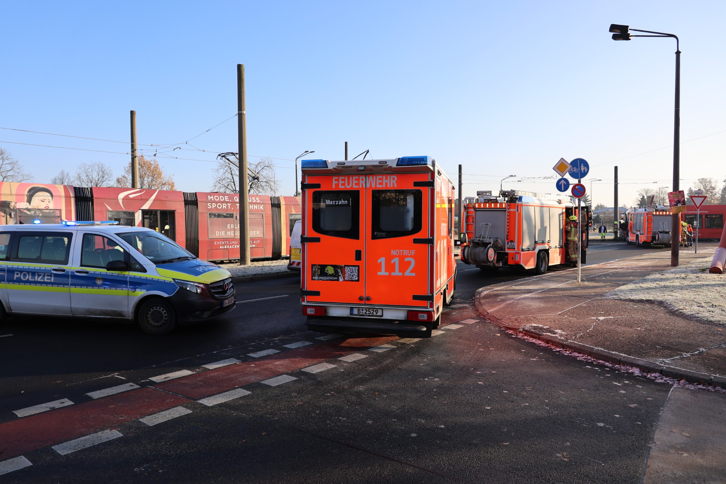 Heute Vormittag ereignete sich in Hellersdorf ein Verkehrsunfall zwischen einer Straßenbahnfahrerin und einem Fahrer eines Mercedes Vito, bei dem zwei Personen verletzt wurden.