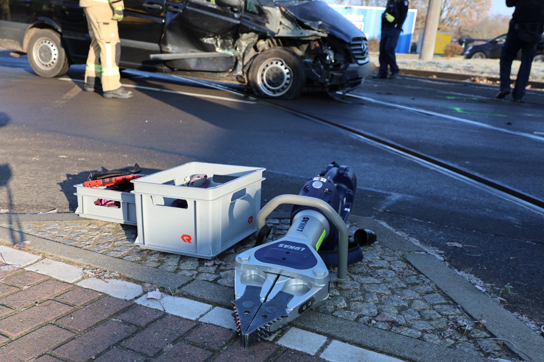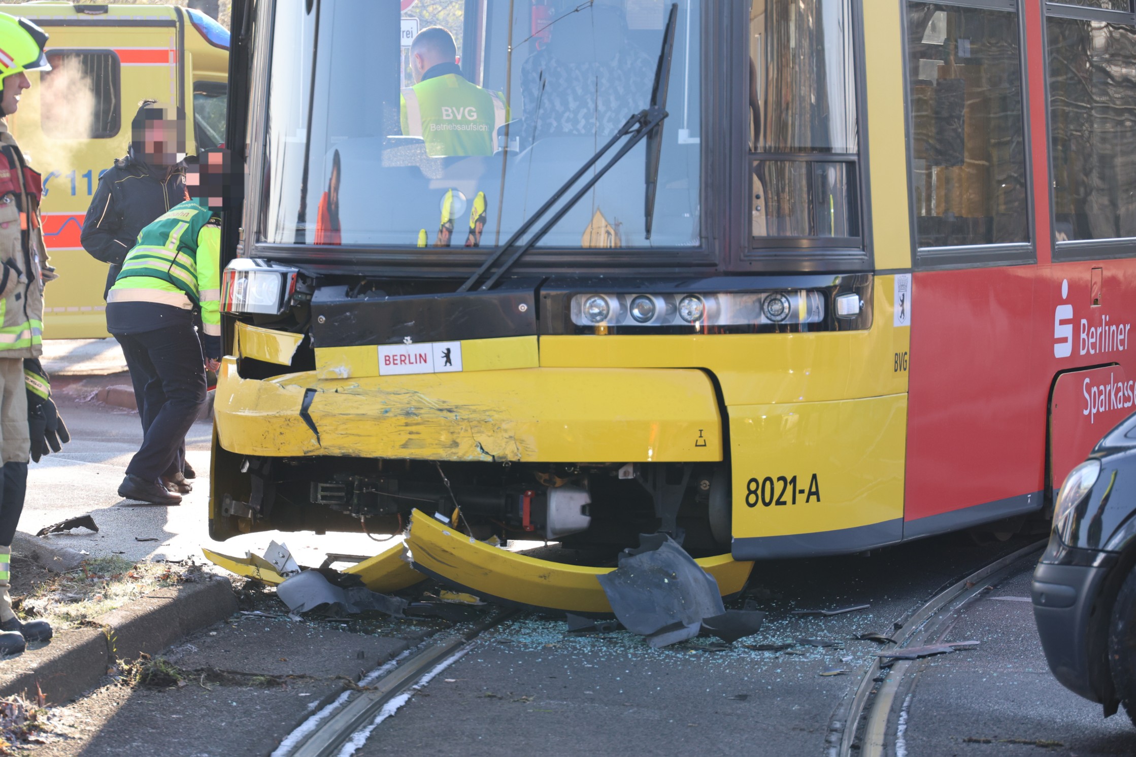 Eine Straßenlaterne wurde beschädigt, ebenso entstanden Sachschäden an der Straßenbahn und am Mercedes.