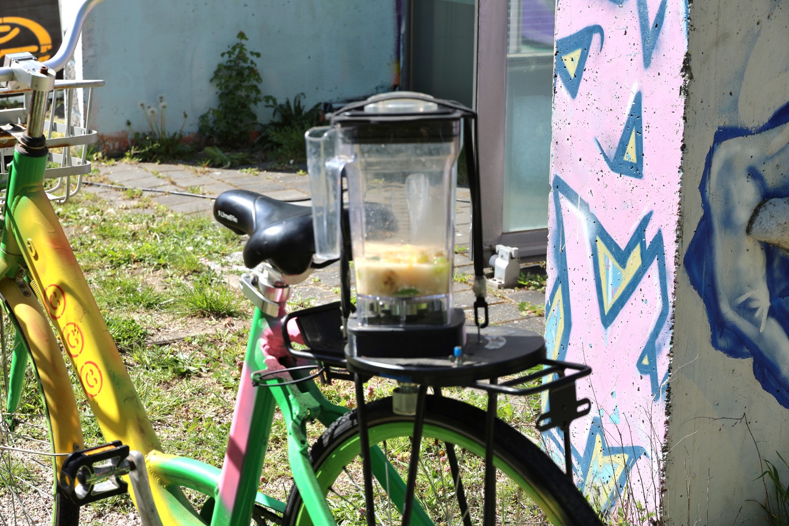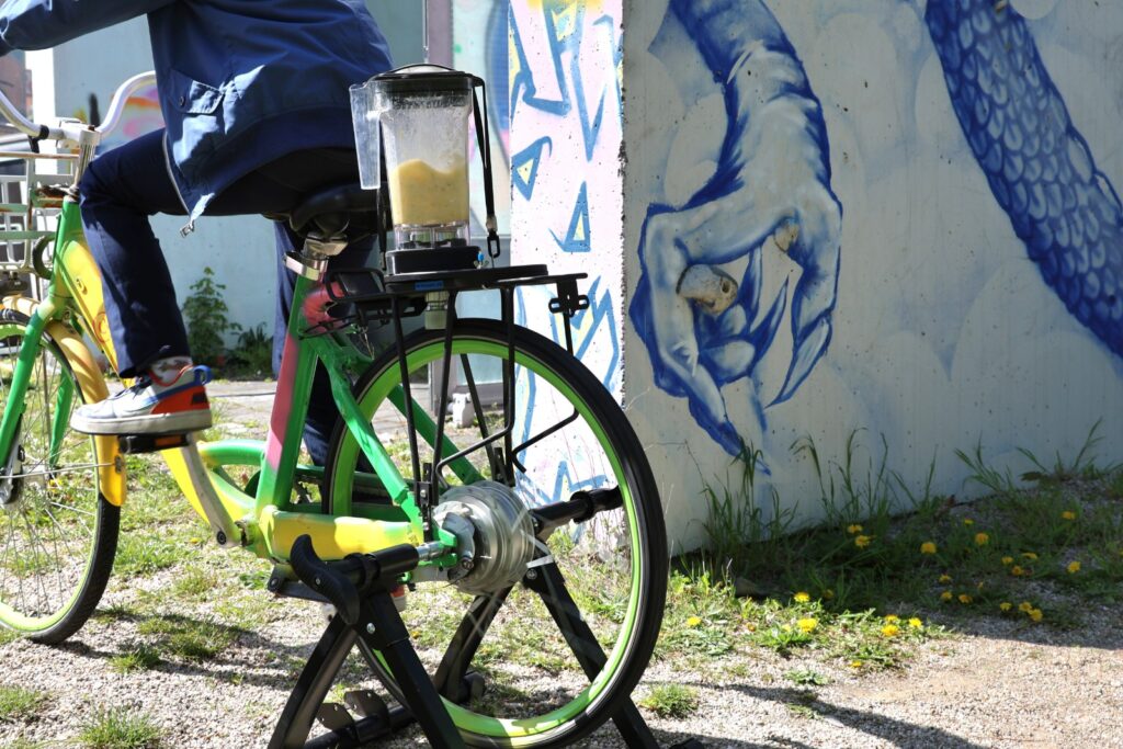 Ein paar Schritte weiter sorgte Kevin für Aufsehen und Aufmerksamkeit. Sein Smoothie-Bike – ein Fahrrad, dessen Tretkraft direkt einen Mixer antreibt – war an diesem Nachmittag eines der beliebtesten Angebote im ganzen Programm.