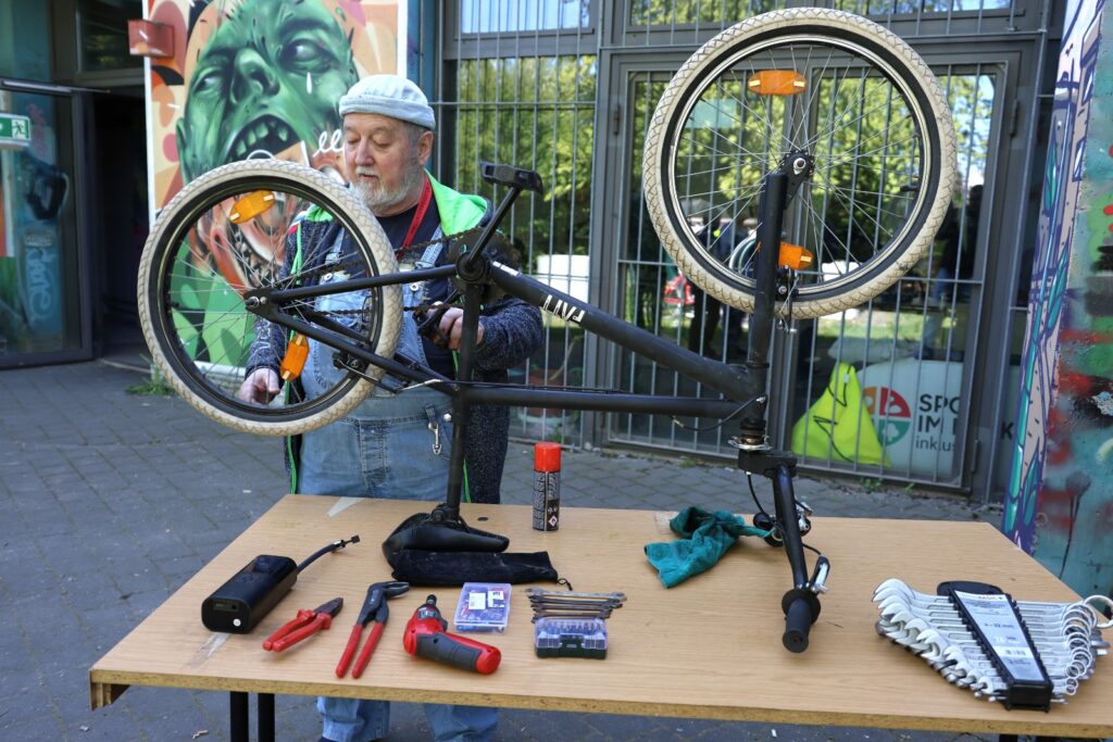 Nur wenige Meter weiter herrschte eine ganz andere Art von Konzentration. Matthias Zwerschke von der Helle Bürgerwerkstatt hatte einen Fahrradständer aufgebaut, Werkzeug ausgebreitet und Geduld mitgebracht.