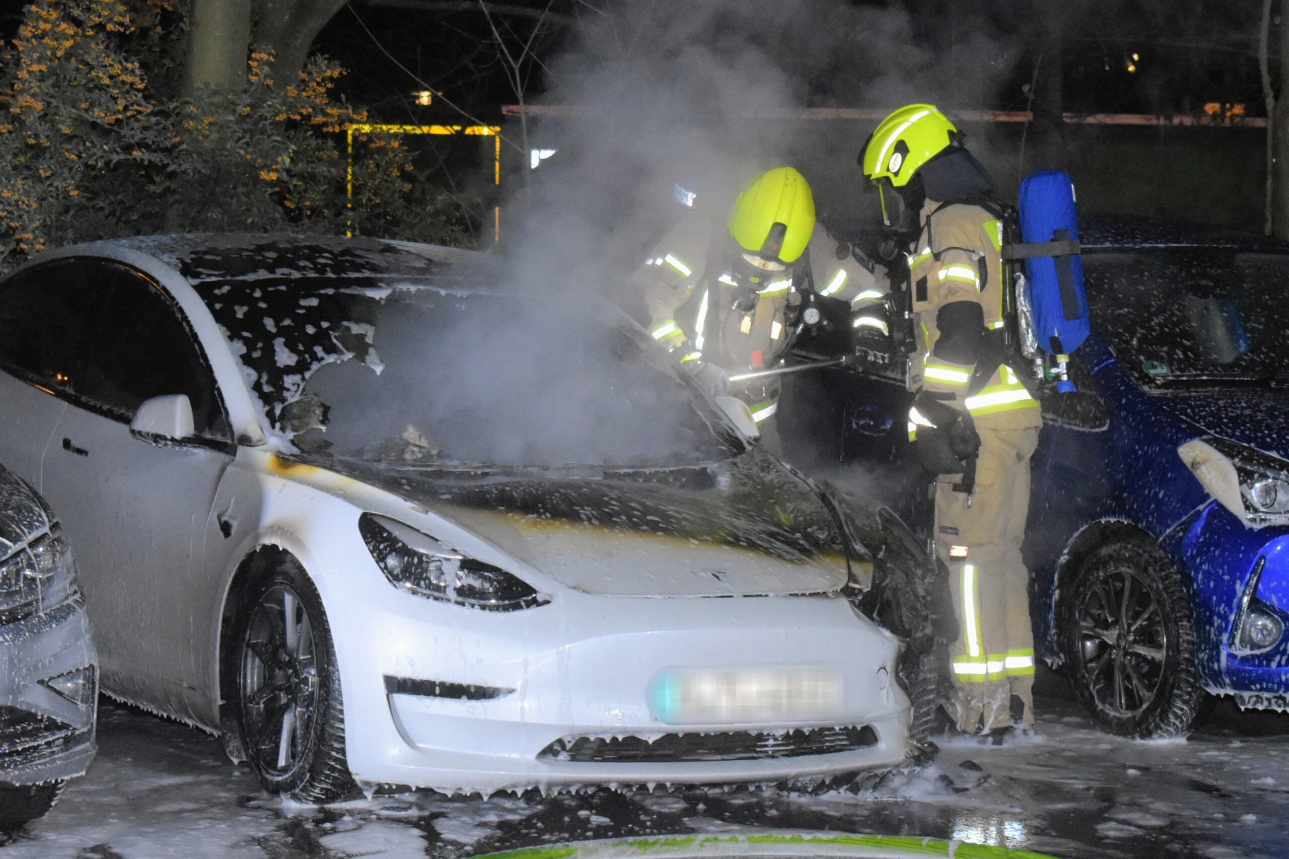 Aufgrund der Besonderheiten von Elektrofahrzeugen setzten die Einsatzkräfte Löschschaum ein. Zusätzlich kam ein sogenannter Akkuspreizer zum Einsatz, mit dem die Motorhaube geöffnet wurde, um Zugang zu sicherheitsrelevanten Fahrzeugkomponenten zu erhalten. Während des Einsatzes reagierten Anwohner umsichtig und entfernten zwei unmittelbar neben dem brennenden Tesla abgestellte Fahrzeuge rechtzeitig vom Brandort, wodurch eine weitere Brandausbreitung verhindert werden konnte.