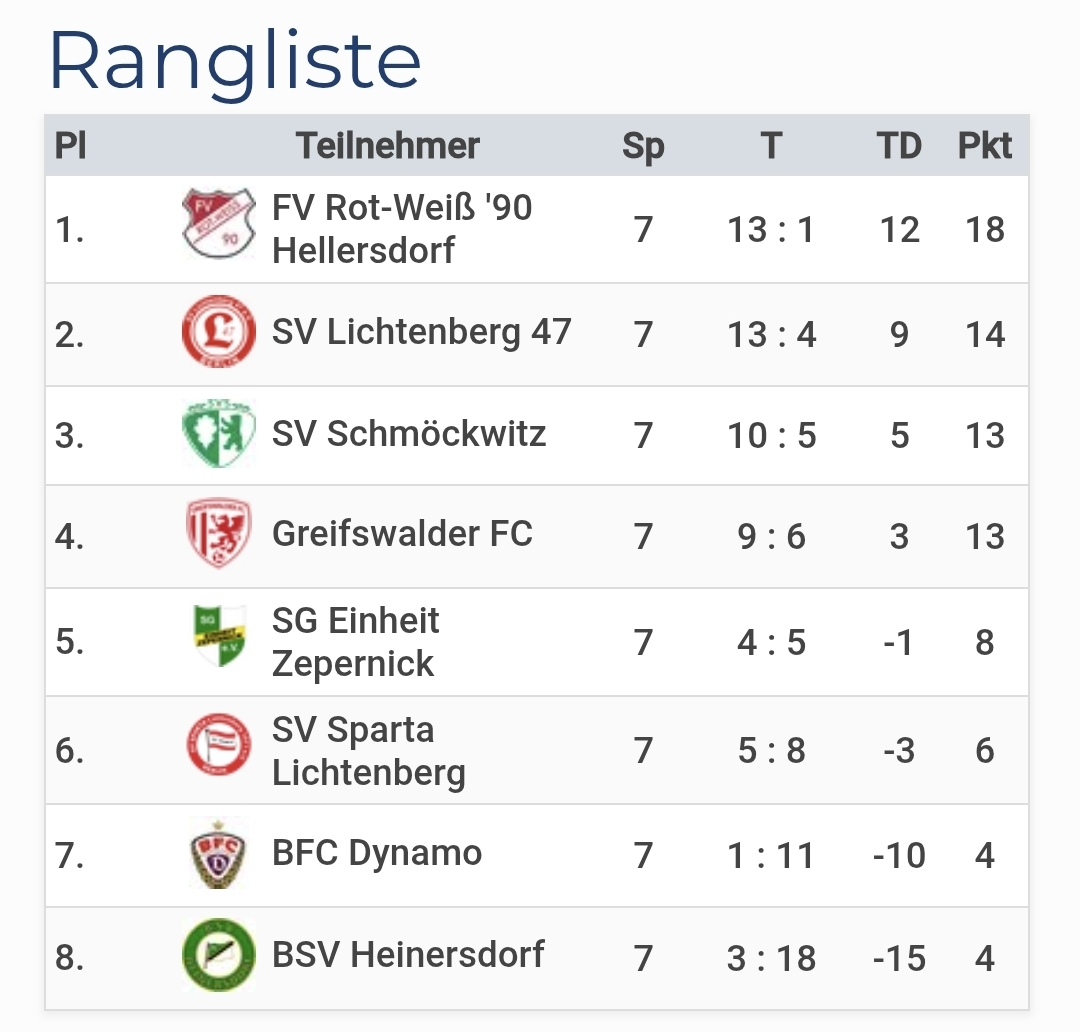 Hinter dem FV Rot-Weiß ’90 Hellersdorf belegte SV Lichtenberg 47 den zweiten Platz, gefolgt von SV Schmöckwitz und Greifswalder FC. Die weiteren Ränge gingen an SG Einheit Zepernick, SV Sparta Lichtenberg, BFC Dynamo und BSV Heinersdorf.