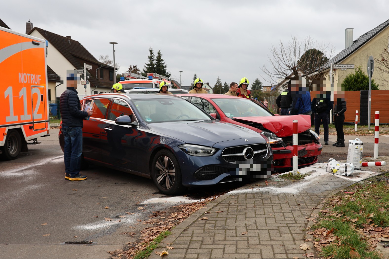 Gegen 14 Uhr waren die Berliner Feuerwehr und die Polizei vor Ort im Einsatz. Nach bisherigen Erkenntnissen kollidierten ein Mercedes- und ein Volkswagenfahrer im Kreuzungsbereich.