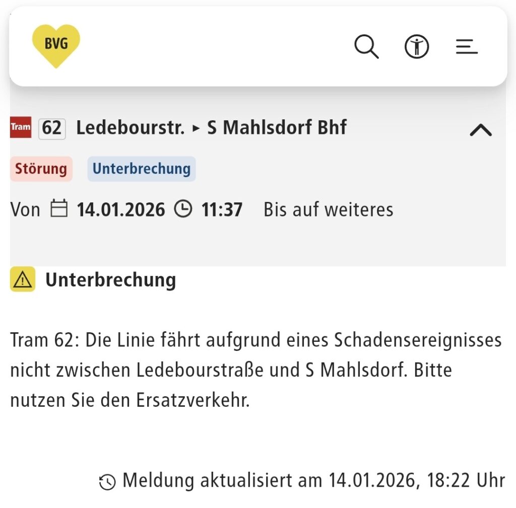 Nach Angaben der Berliner Verkehrsbetriebe ist der Straßenbahnverkehr der Linie 62 weiterhin unterbrochen. Die Tram fährt aufgrund des Schadensereignisses nicht zwischen Ledenbourstraße und S Mahlsdorf Bahnhof. Die Störung besteht seit dem 14.01.2026, 11:37 Uhr und gilt bis auf Weiteres.