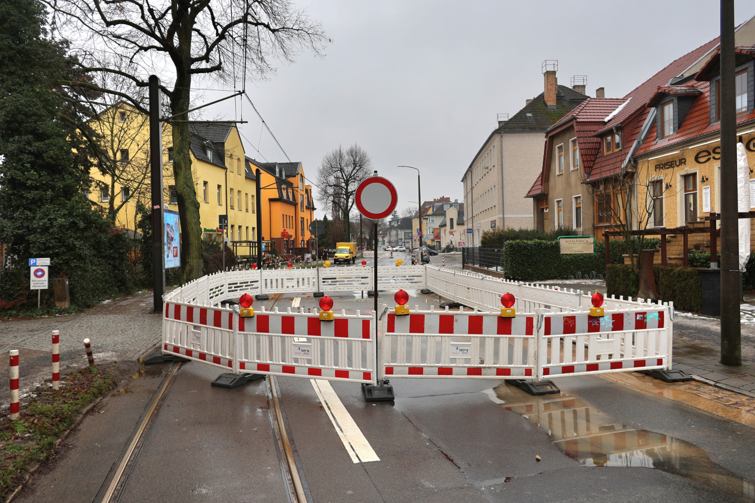 Um den Umfang der Unterspülung sicher feststellen zu können, musste die Hönower Straße vollständig gesperrt werden. Die Sperrung gilt für den Abschnitt zwischen Fritz-Reuter-Straße und Wilhelmsmühlenweg. Davon ist auch der Straßenbahnverkehr betroffen.