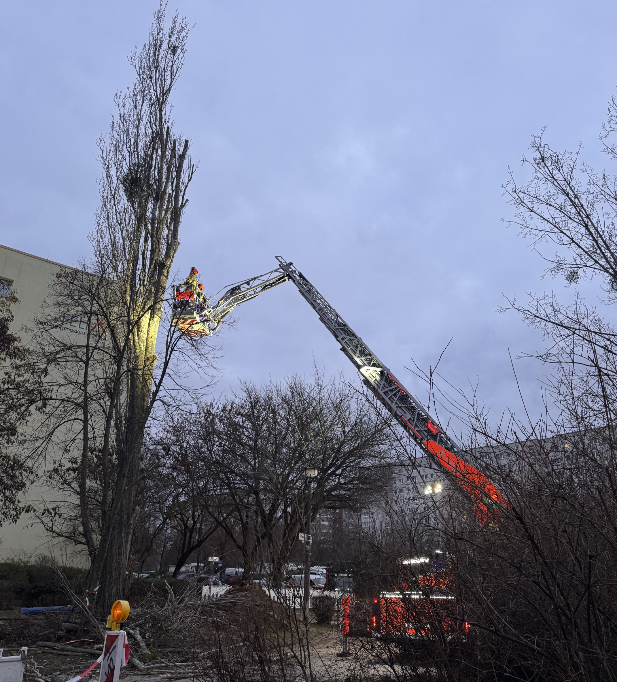 Im Rahmen der Amtshilfe wurde daher die Berliner Feuerwehr alarmiert, um den Baum zu fällen, wie Adrian Wenzel vom Pressedienst der Berliner Feuerwehr mitteilte. Hierzu kommt eine Drehleiter zum Einsatz, um den Baum zunächst zurückzuschneiden und anschließend vollständig zu fällen.