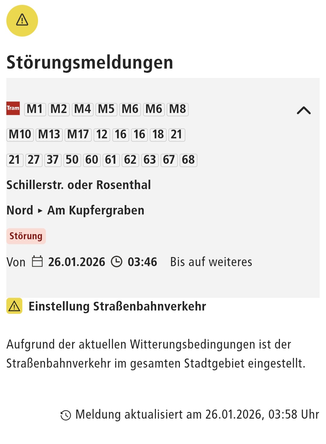 Die Maßnahme gilt seit Montag, 26. Januar 2026, 03:46 Uhr. Eine Prognose zur Wiederaufnahme des Straßenbahnverkehrs konnte bislang nicht genannt werden. Fahrgäste werden gebeten, auf U-Bahn-, S-Bahn- und Busverbindungen auszuweichen und sich vor Fahrtantritt über die aktuellen Verkehrsmeldungen zu informieren. Die Störungsmeldung wurde zuletzt um 03:58 Uhr aktualisiert.
