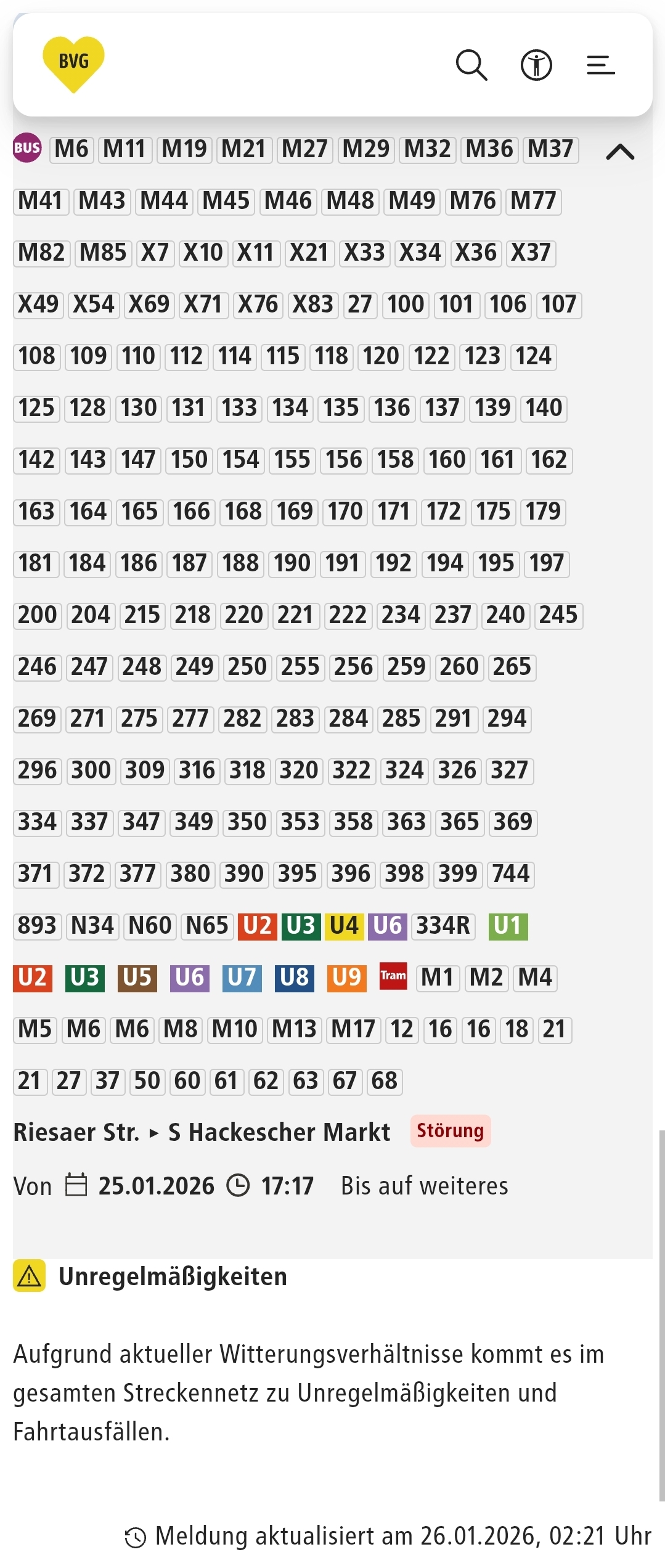 Aufgrund der anhaltenden Witterungsverhältnisse kommt es derzeit im gesamten Streckennetz zu Unregelmäßigkeiten und weiteren Fahrtausfällen. Auch bei den verbleibenden Verkehrsangeboten sind Verspätungen und kurzfristige Änderungen nicht ausgeschlossen. Fahrgäste sollten mehr Zeit einplanen und die aktuellen Informationen der BVG regelmäßig prüfen.